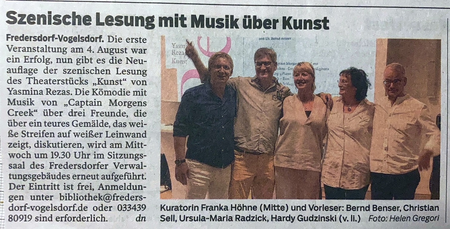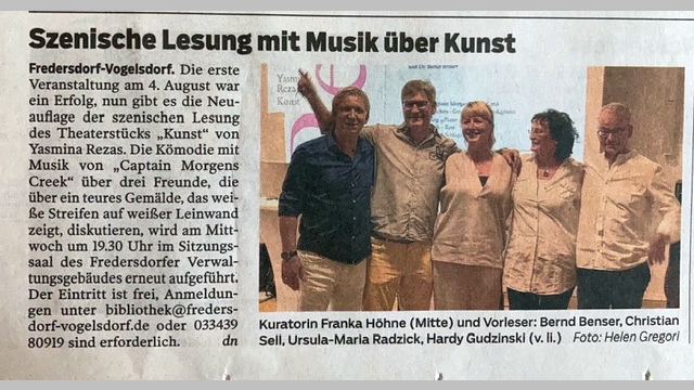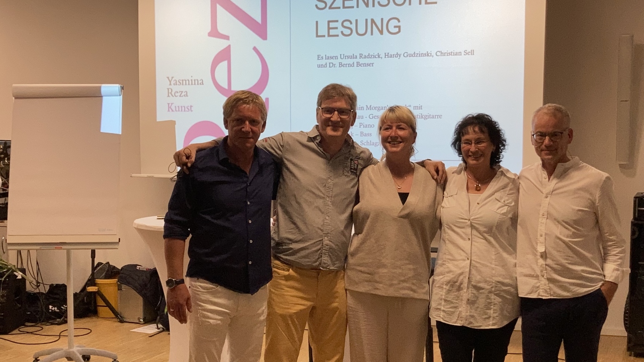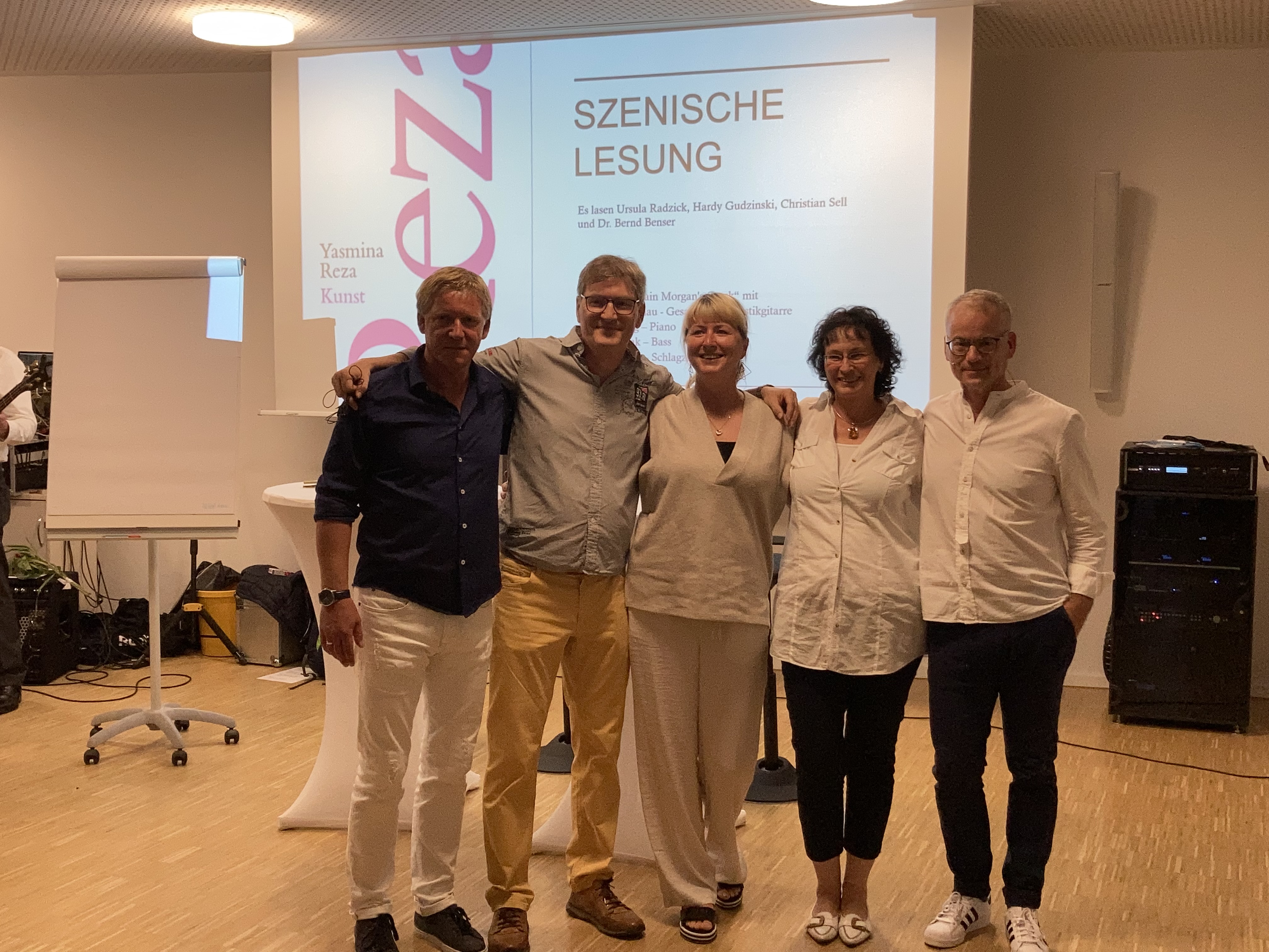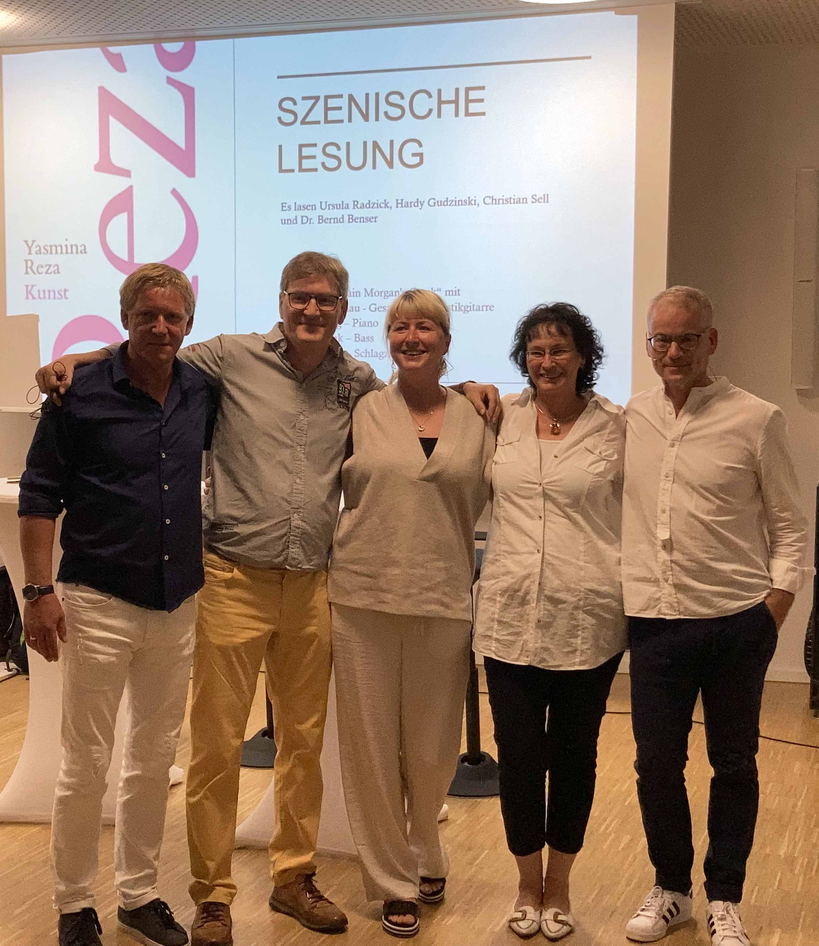 Die Darsteller: Dr. Bernd Benser als Serge, Hardy Gudzinski als Marc, Christian Sell als Yvan, Ursula-Maria Radzick als Szenenleserin und Franka Höhne als Regisseurin.