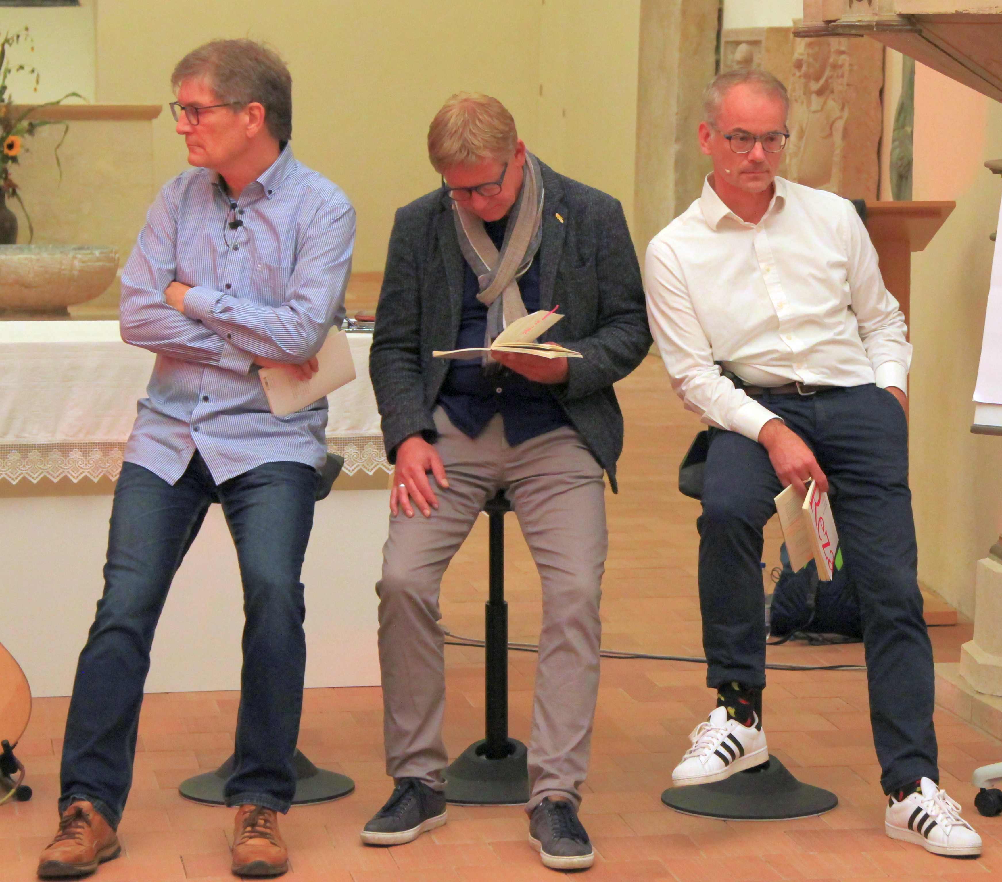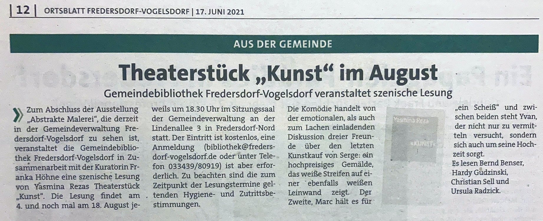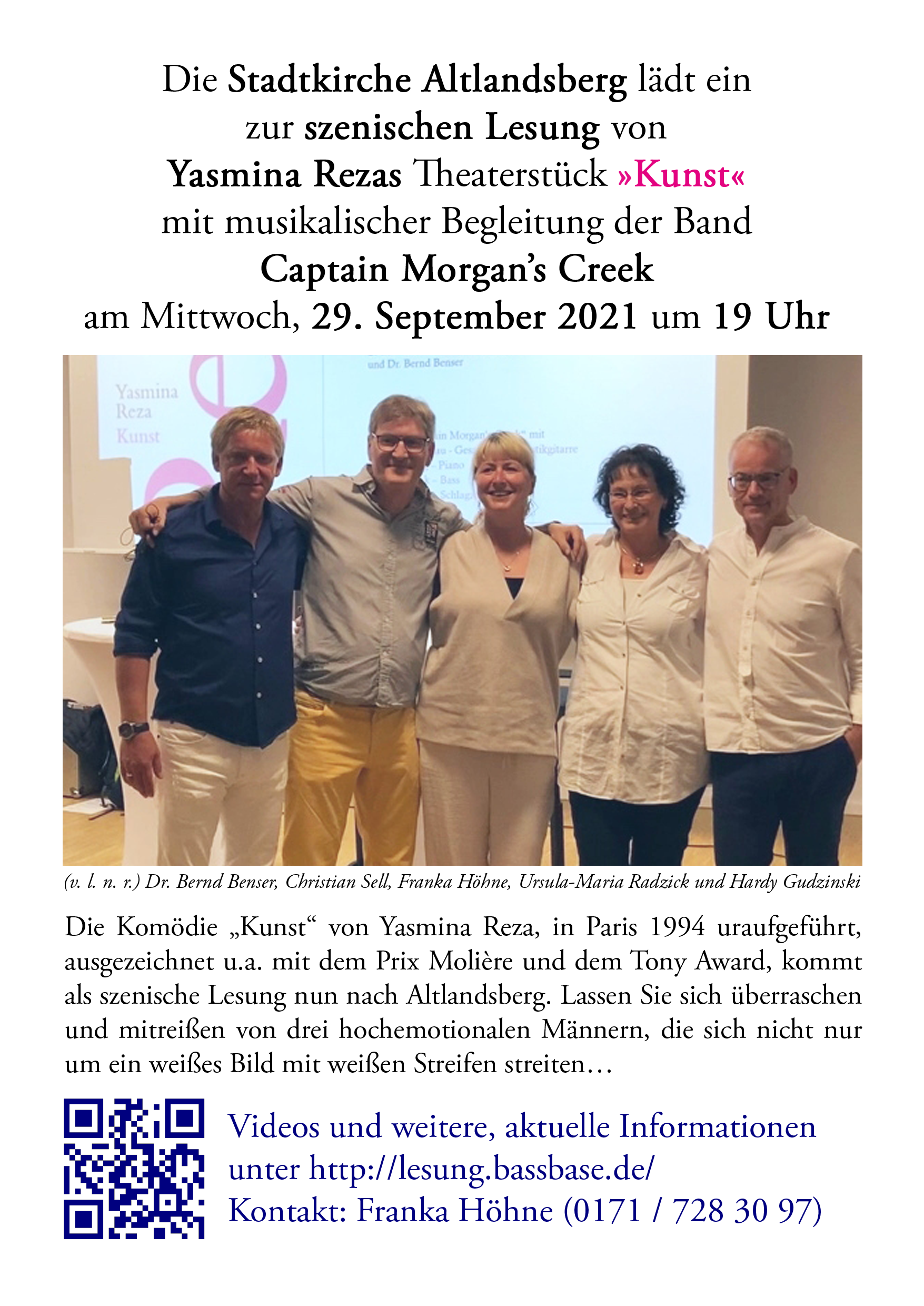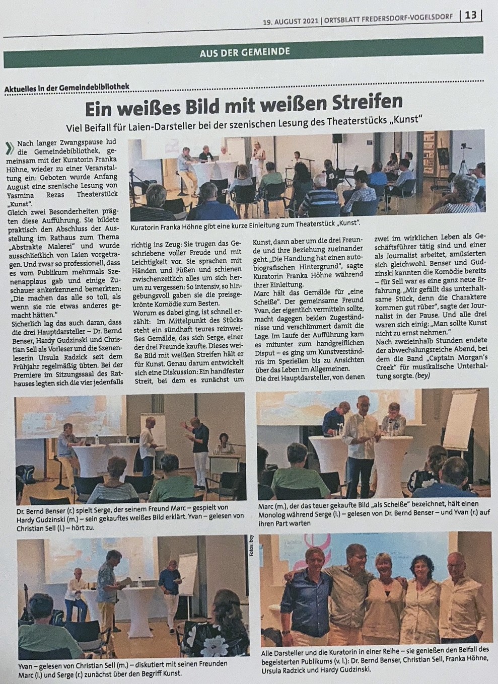 Die Darsteller: Dr. Bernd Benser als Serge, Hardy Gudzinski als Marc, Christian Sell als Yvan, Ursula-Maria Radzick als Szenenleserin und Franka Höhne als Regisseurin.