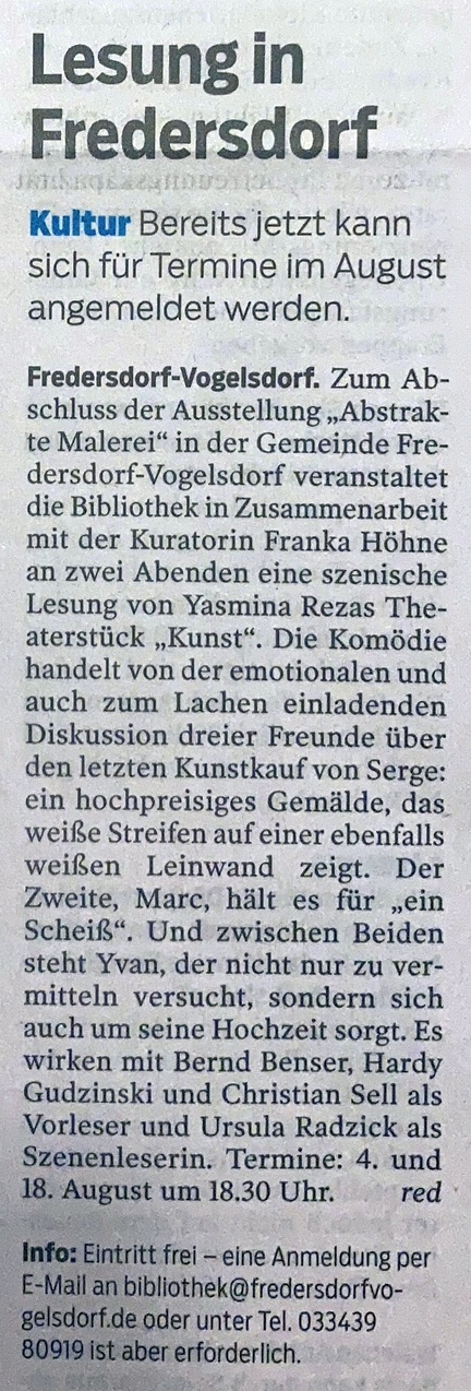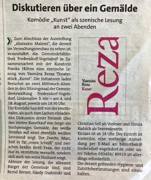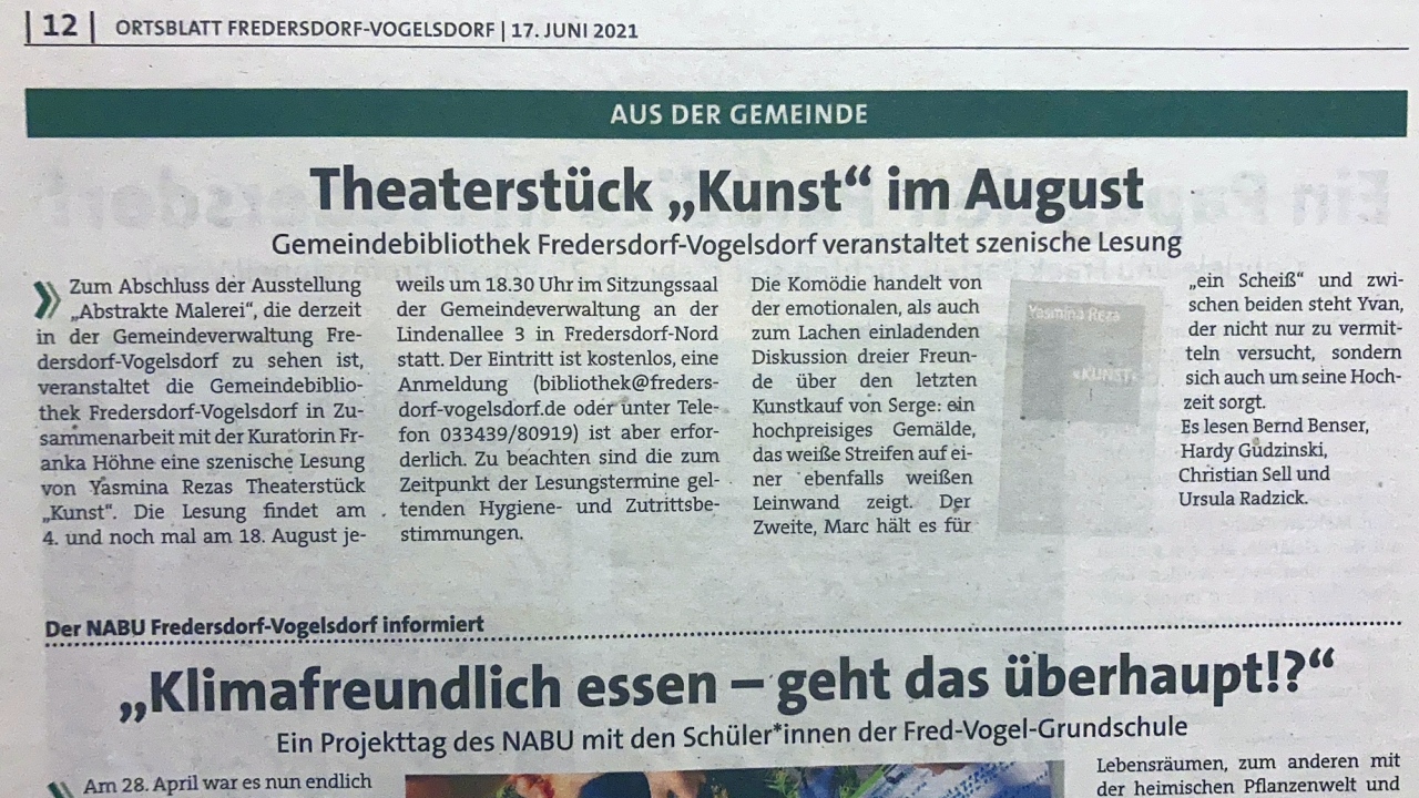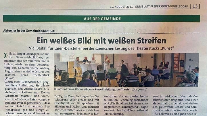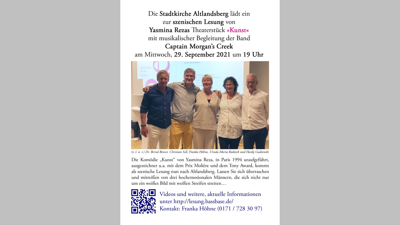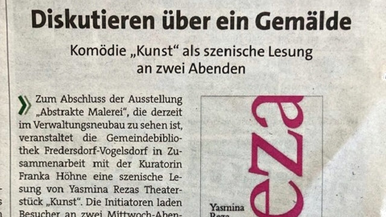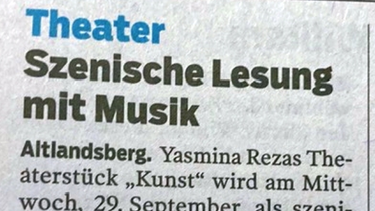 Die Komödie „Kunst“ von Yasmina Reza, in Paris 1994 uraufgeführt, ausgezeichnet u.a. mit dem Prix Molière und dem Tony Award, kommt als szenische Lesung in unsere Region. Lassen Sie sich überraschen und mitreißen von drei hochemotionalen Männern, die sich nicht nur um ein weißes Bild mit weißen Streifen streiten…